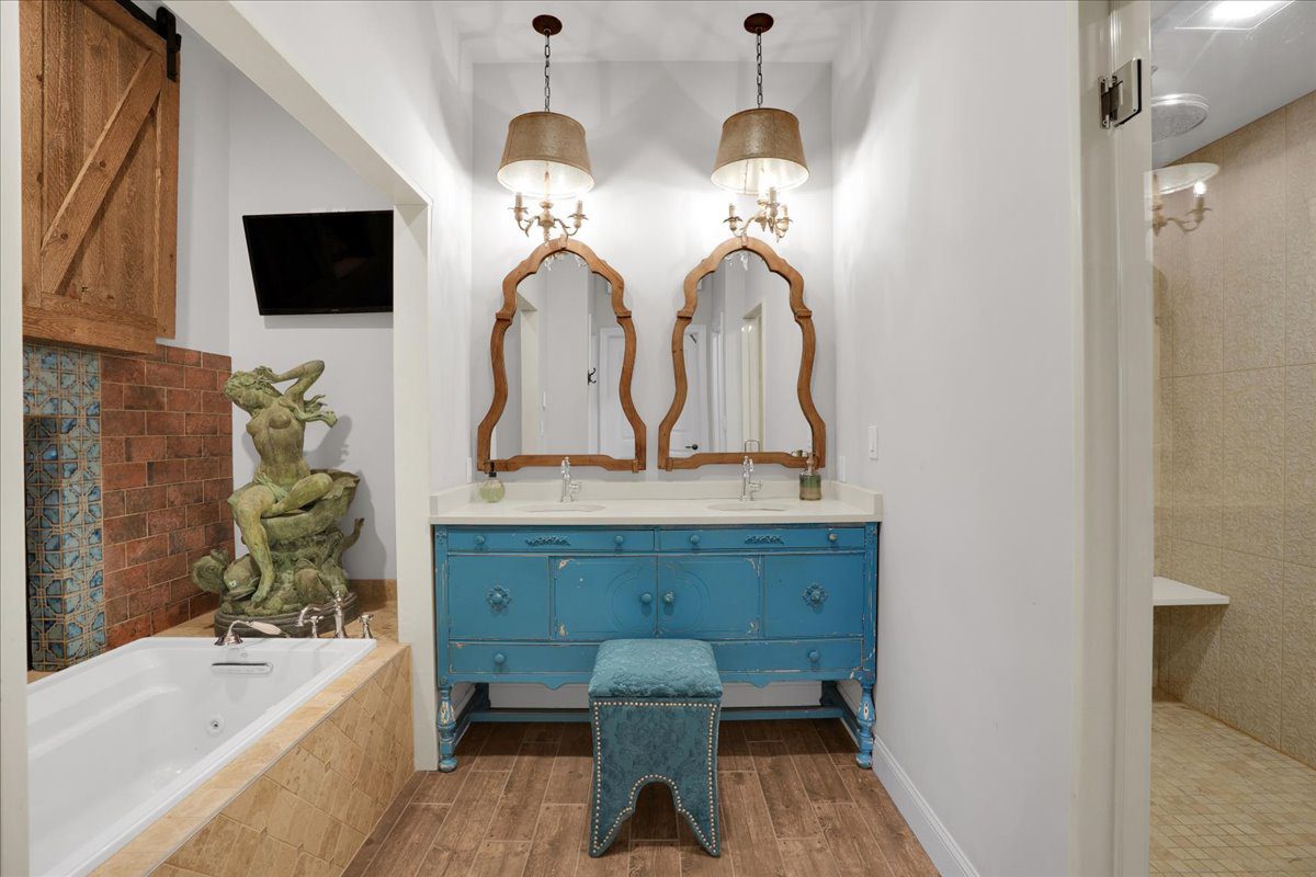 The grounds have been fully developed with countless amenities to enhance outdoor living. A private lazy river curves through the backyard, accompanied by a covered cabana with a full kitchen and grill. A three-car garage includes its own full bath, expanding the functional use of the property for hosting and beyond.